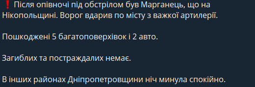 "После полуночи под обстрелом был Марганец, что на Никопольщине. Враг ударил по городу из тяжелой артиллерии", — рассказал Лысак.