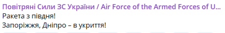 По предварительному сообщению, россияне с юга провели пуски ракет, одна из которых сейчас летит в сторону Днепра и Запорожья.